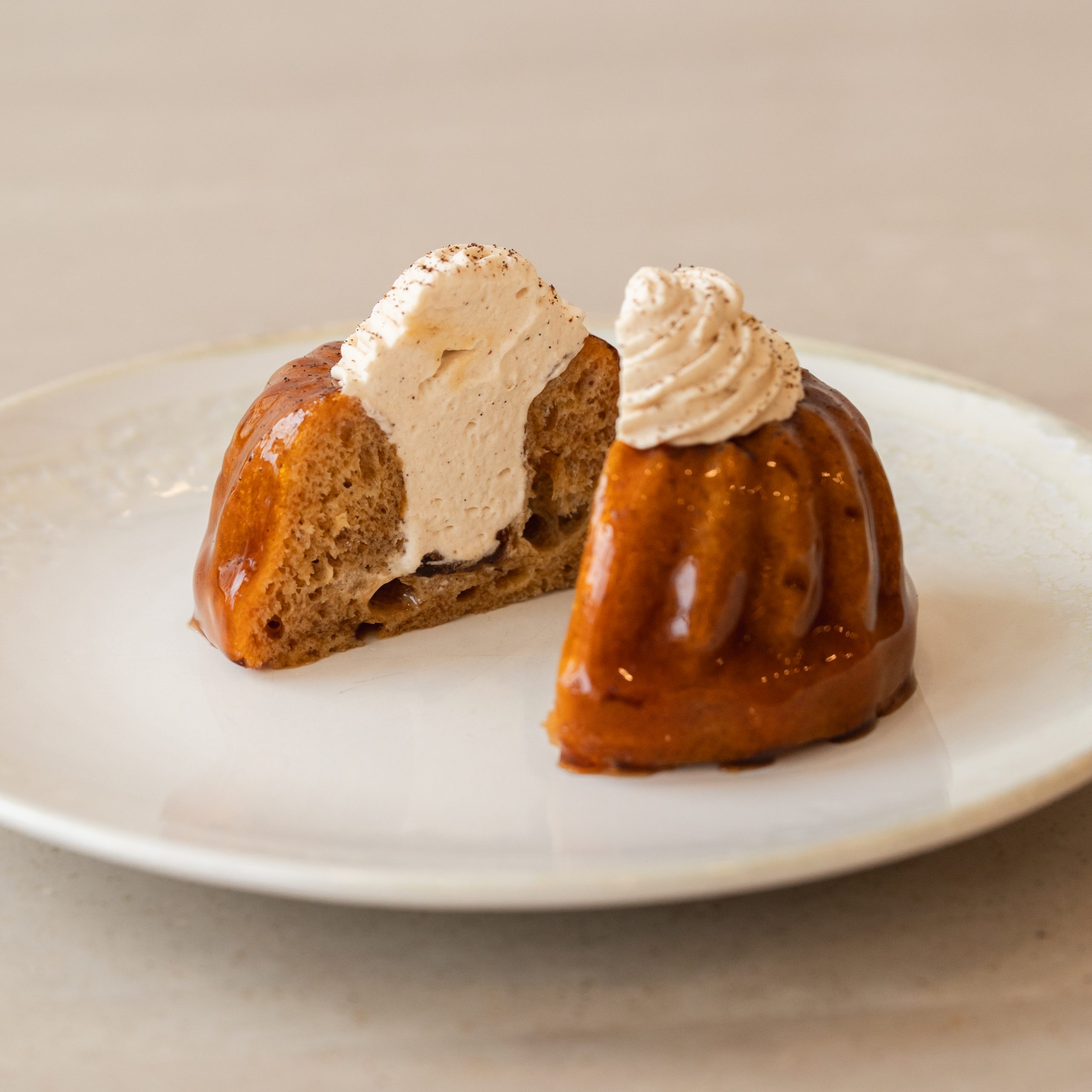 Composition : Baba dough soaked in a syrup of rum, orange, and lemon, topped with vanilla whipped cream.