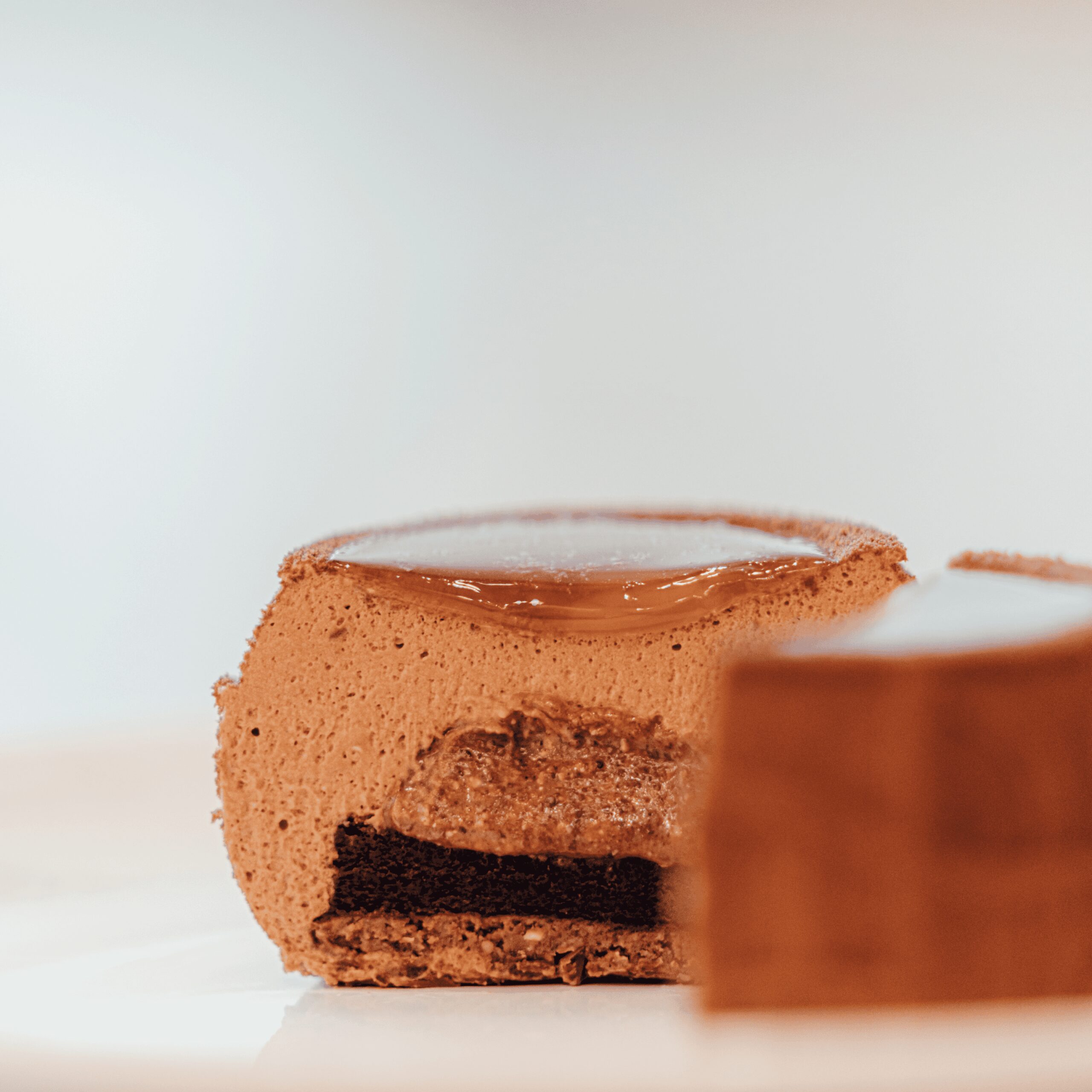Composition : Crispy cocoa nib praline, flourless chocolate biscuit, light chocolate mousse, and mucilage gel